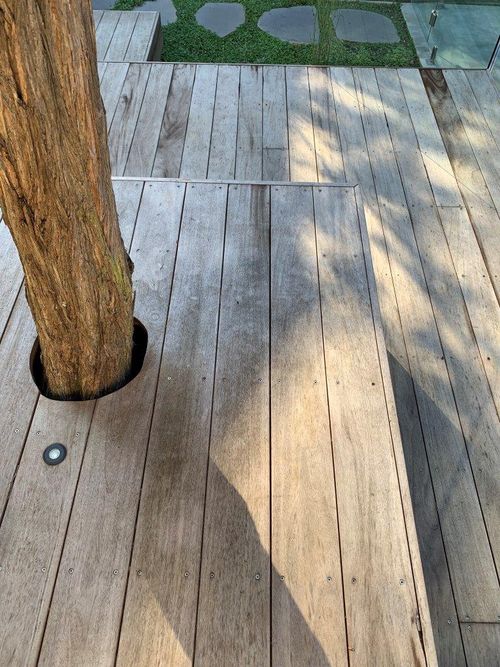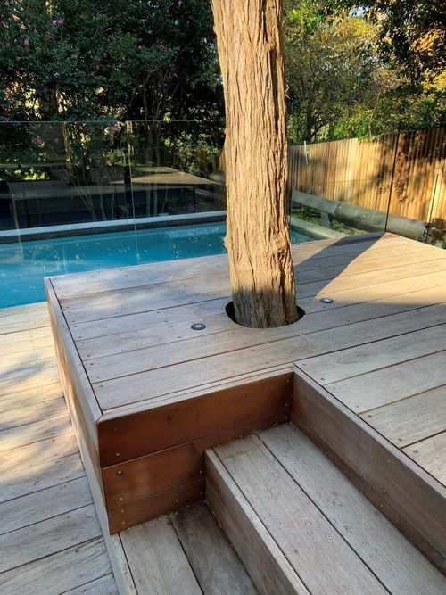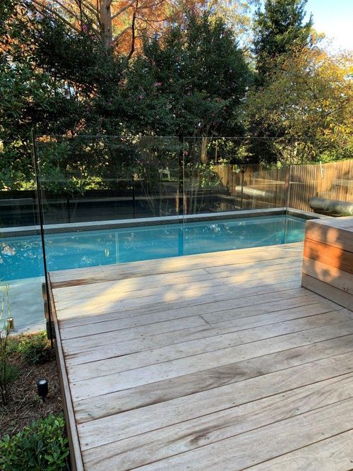 The plantation mahogany decking was left untreated to silver off to complement the light grey limestone pavers, garden steppers and existing house colours. Black waterline tiles matched existing steel balustrading and set off the light blue pebble pool render. Rustic hardwood slat screening doubled as pool fencing along the boundary and frameless glass fencing elsewhere kept pool and garden visibility to a maximum.